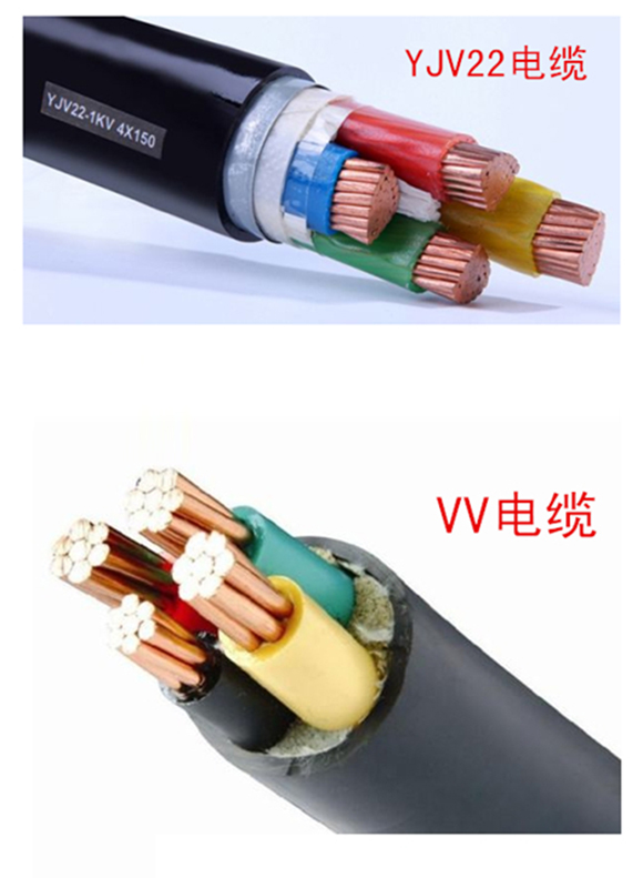 在結構中,YJV22電纜的絕緣分色是半透明的,而VV22電纜是不透明的,這點可明顯區分2種型號電纜。前者是聚乙烯絕緣無鹵元素無污染而且在機械和電氣性能優于后者的聚氯乙烯絕緣。